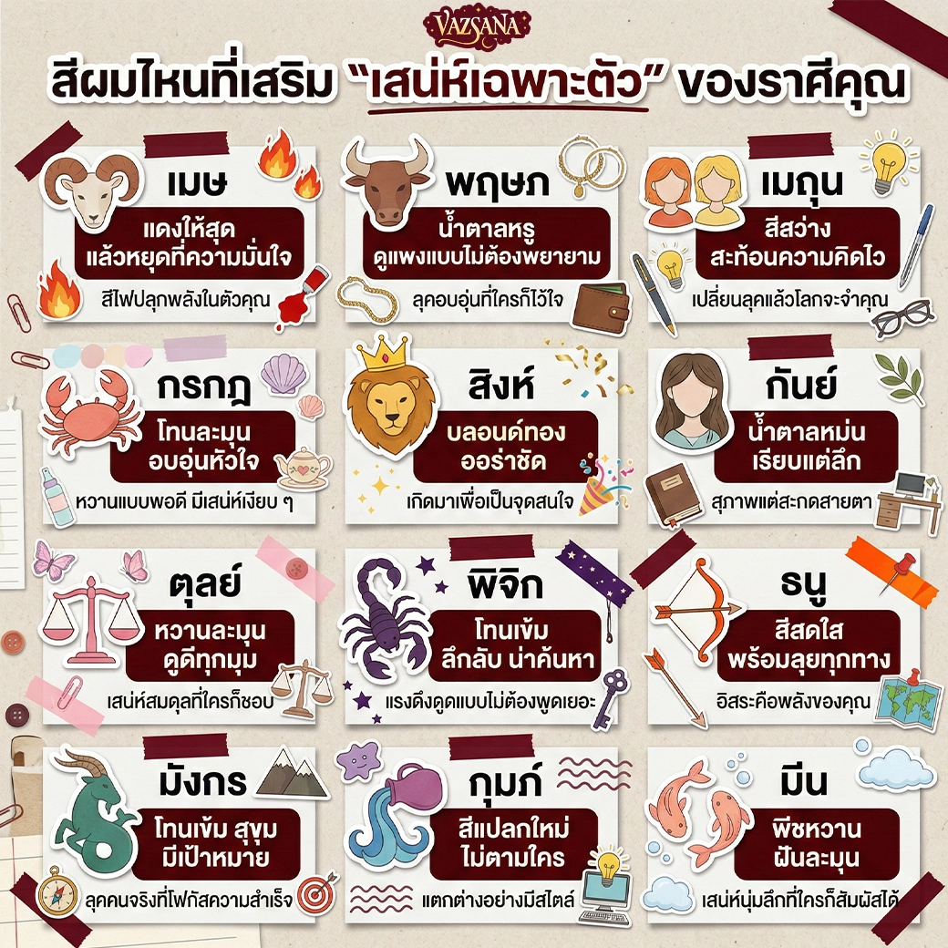 การเลือกสีผมควรดูทั้งโทนผิว ไลฟ์สไตล์ และความเหมาะสมกับงานหรือสังคมรอบตัว แนวทางตามราศีเป็นเพียงความเชื่อส่วนบุคคล ใครชอบโทนไหนแล้วมั่นใจที่สุด แบบนั้นเหมาะกับคุณมากที่สุด